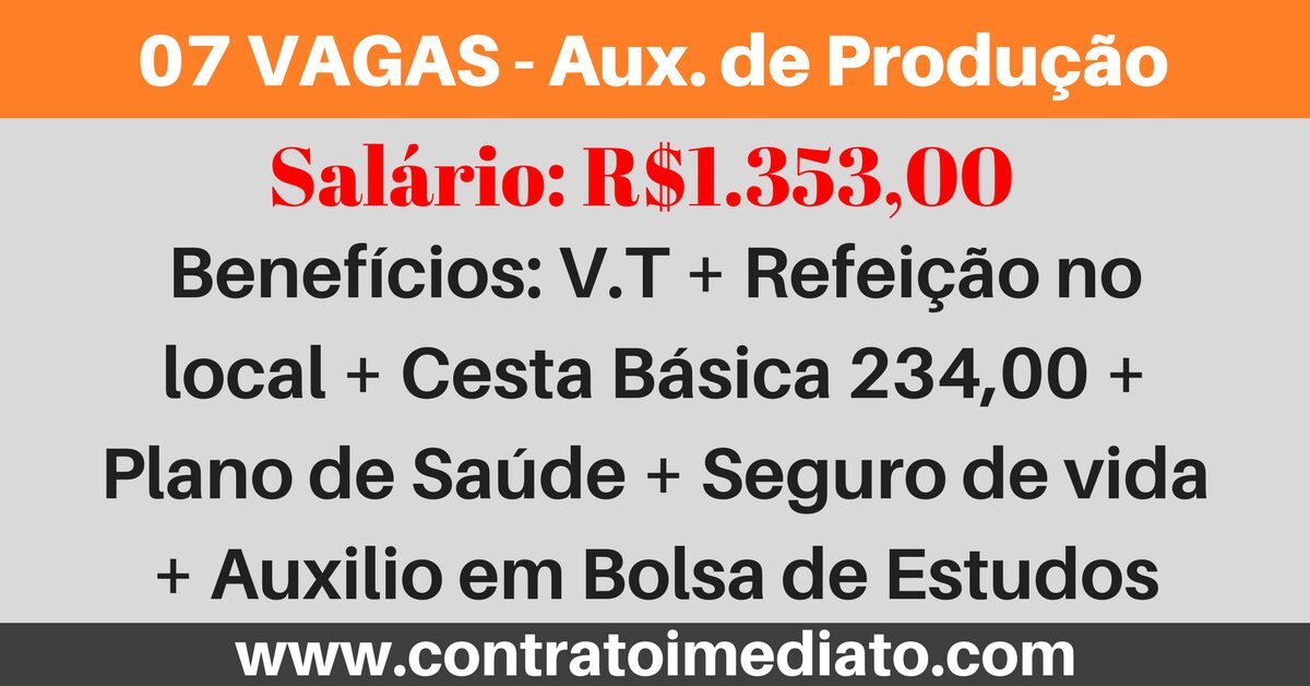 Benefícios: V.T + Refeição no local + Cesta Básica 234,00+ Plano de Saúde + Seguro de vida + Auxilio em Bolsa de Estudos