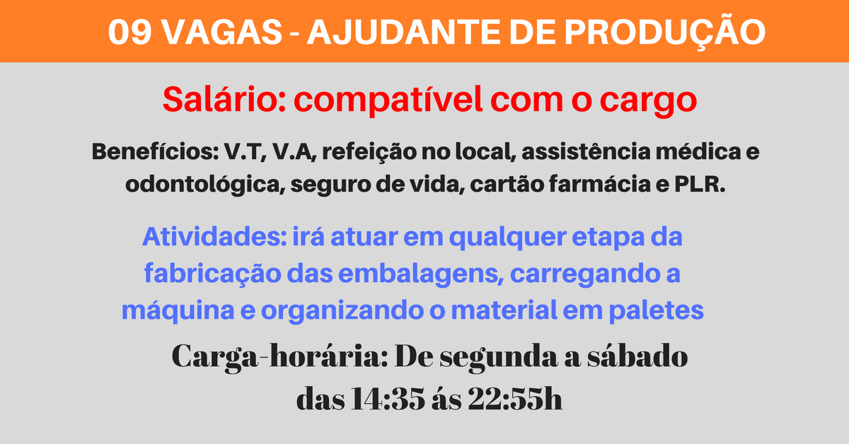 Atividades: irá atuar em qualquer etapa da fabricação das embalagens carregando a máquina e organizando o material em paletes.