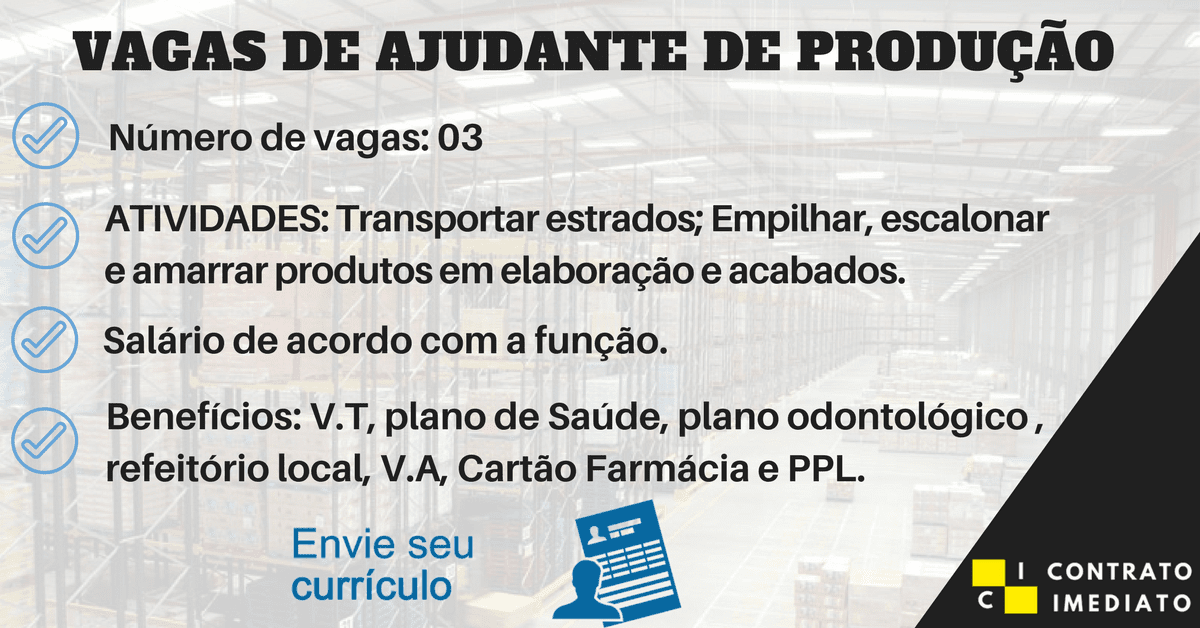 Requisitos: Ensino fundamental completo. Preferencialmente residir em bairros próximos e fácil acesso à empresa. Interessados cadastrar o currículo Clicando Aqui
