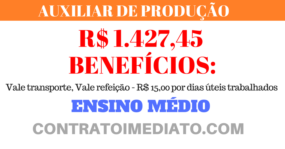 Benefícios: vale transporte + vale refeição (R$15,00 por dias úteis trabalhados).