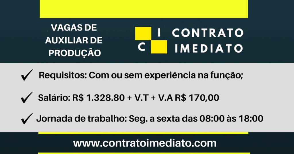 Data da publicação: 29/08/2018 Cargo: Auxiliar de produção Quantidade de vagas: 2 vaga(s) Descrição: Com ou sem experiência, para