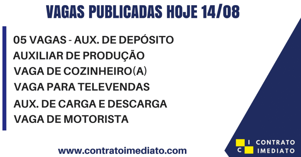 Cargo: Motorista Entregador Código da vaga: 4679 LOCAL: Curitiba – PR Descrição: ESCOLARIDADE: Ensino Médio Completo ATIVIDADES: Entregar e […]