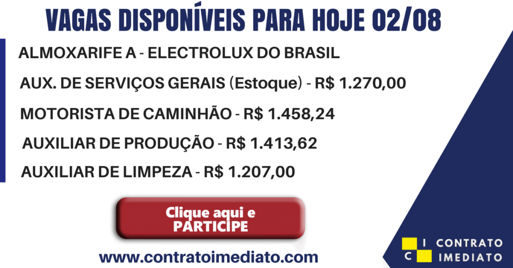 Cargo: Almoxarife A CONTRATO DETERMINADO DE 6 A 18 MESES **Início Imediato** Empresa: Electrolux do Brasil S/A Atividades: Participação