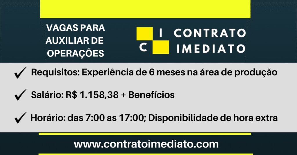 Cargo: Auxiliar de Operações Requisitos: Ensino médio Completo; Experiência na área de produção. Nível da vaga: Operacional Salário: R$ […]