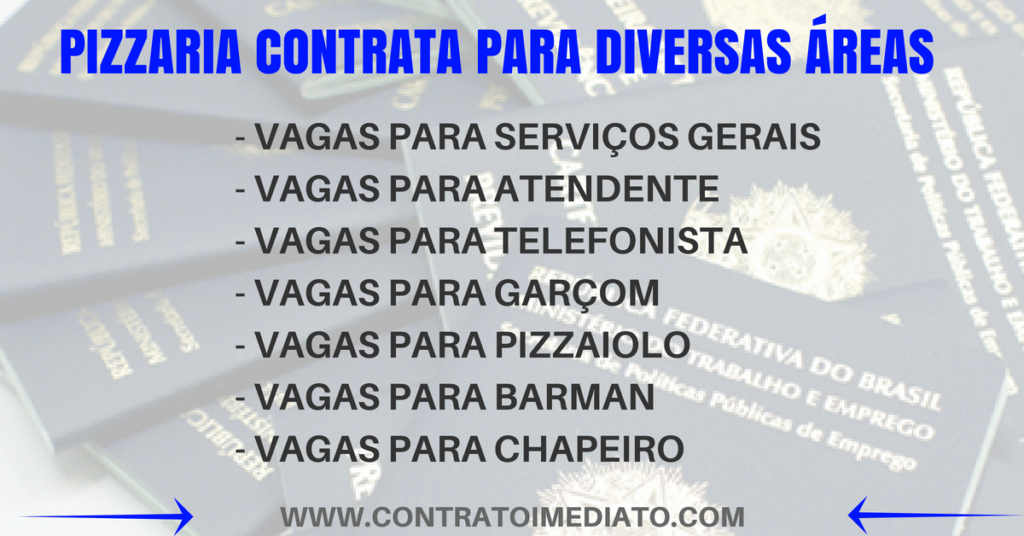 Pizzaria contrata para diversas áreas: – Serviços Gerais – Atendente – Telefonista – Garçom – Pizzaiolo – Barman –