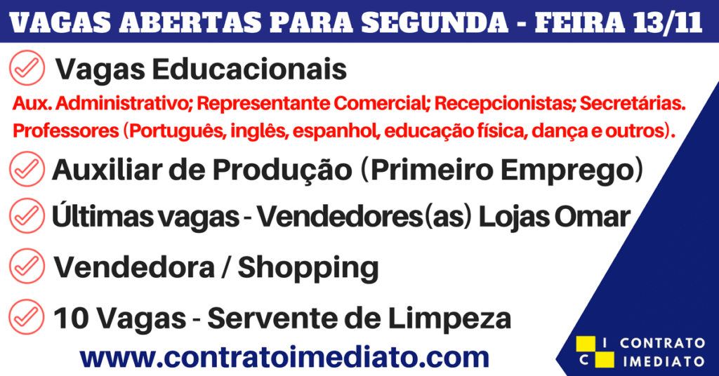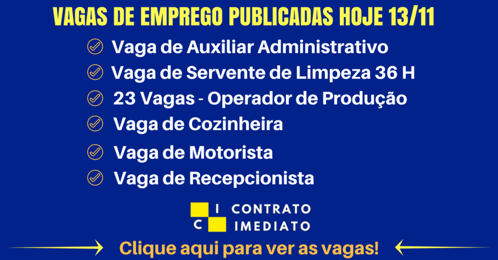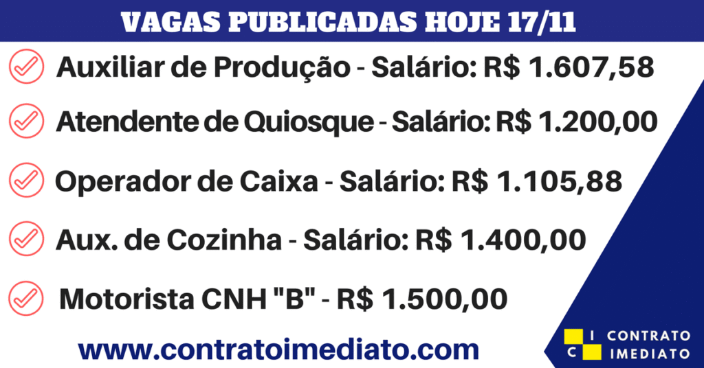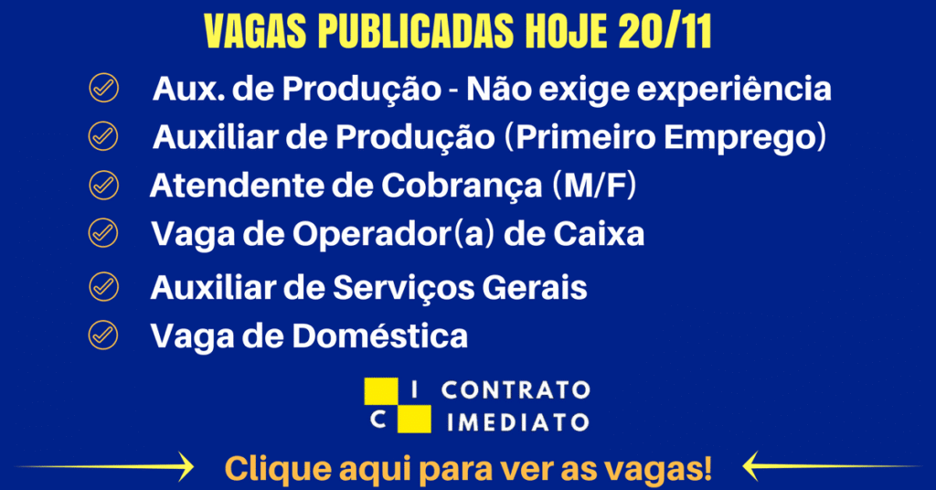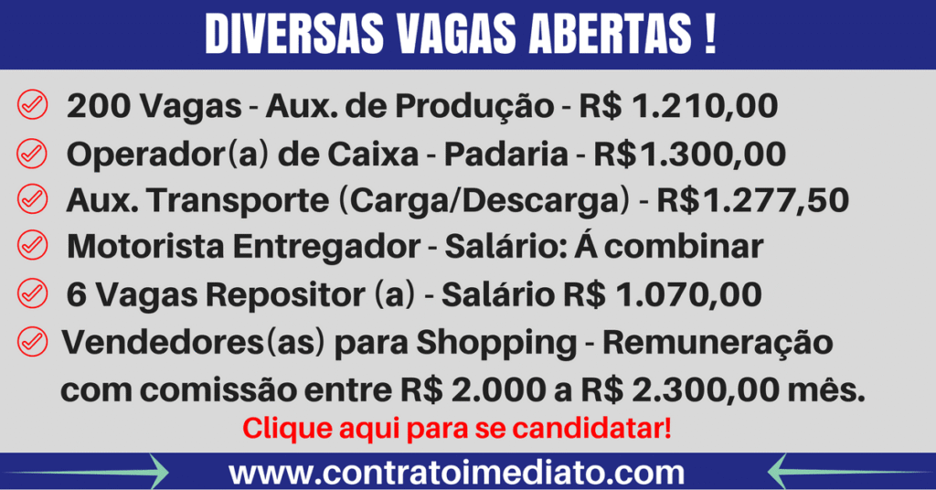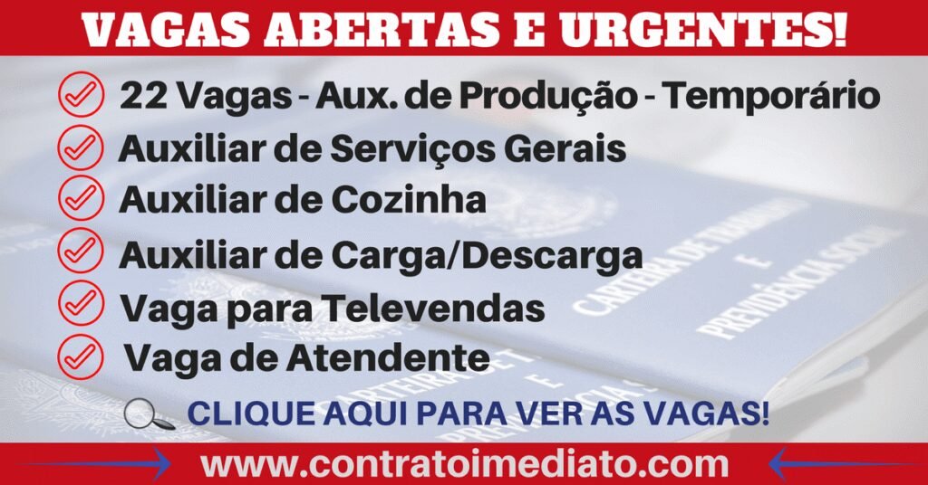 Vaga de Auxiliar de Produção Descrição: Masculino, oportunidade para primeiro emprego. Dispensado do quartel. Ensino médio completo. Horário: 8h00
