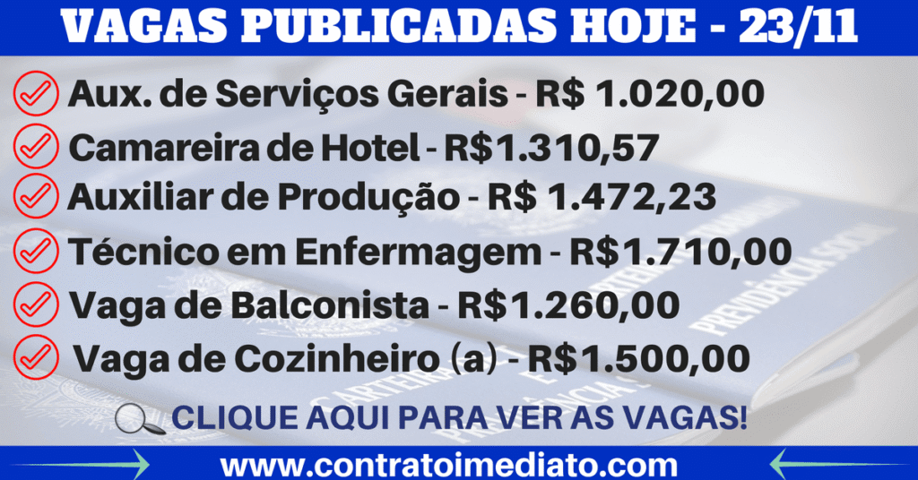 Cargo: Camareira de Hotel Descrição:Ensino Médio; Com 6 meses de experiência na função. Sexo: Feminino Local: Curitiba – PR […]