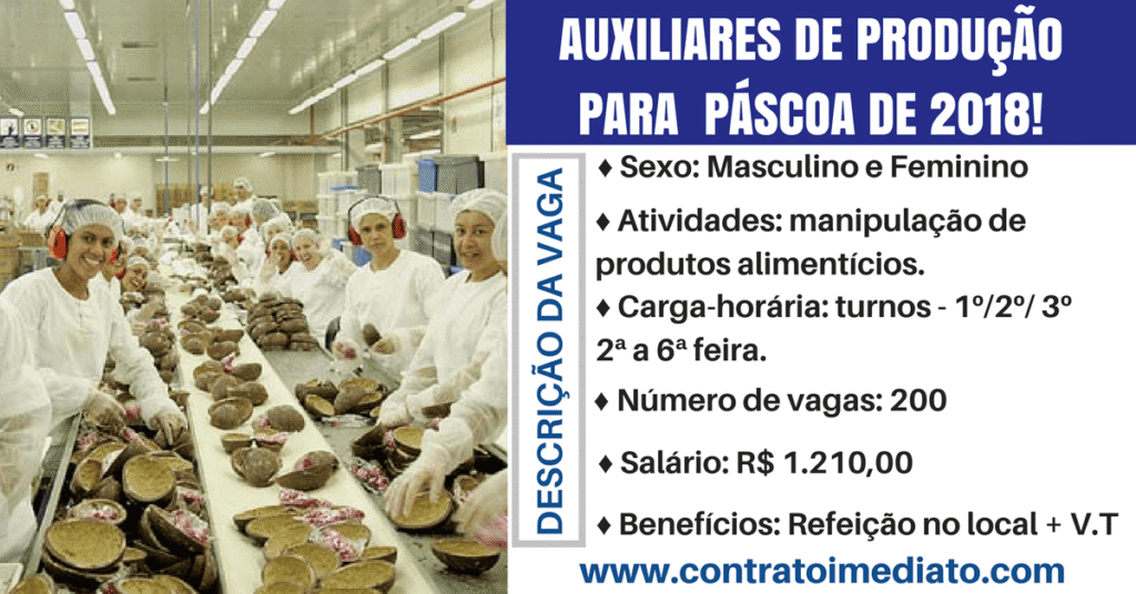 Cargo: Auxiliar de Produção Área profissional: produção Carga-horária: turnos – 1º/2º/ 3º – 2ª a 6ª feira Número de