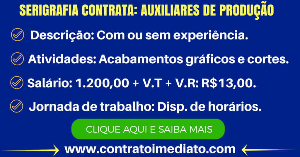 Serigrafia contrata: Auxiliares de produção Local de trabalho: Colombo – PR Jornada de trabalho: Disp. de horários Descrição da