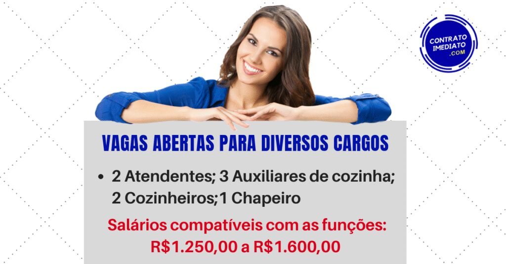Estamos aumentando nosso quadro de funcionários, estamos contratando: 2 Atendentes 3 Auxiliares de cozinha 2 Cozinheiros 1 Chapeiro Salários