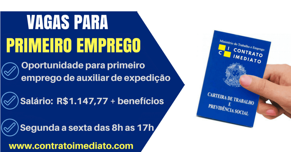 Descrição da vaga: Oportunidade para primeiro emprego de auxiliar de expedição. Salário inicial: R$ 1.147,77 + benefícios Jornada de