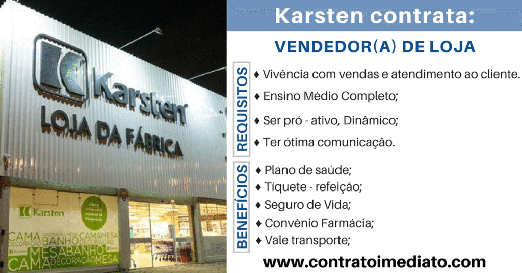 Cargo: Vendedor de Loja Empresa: Karsten Local de trabalho: Curitiba – PR Requisitos: Vivência com vendas e atendimento ao […]