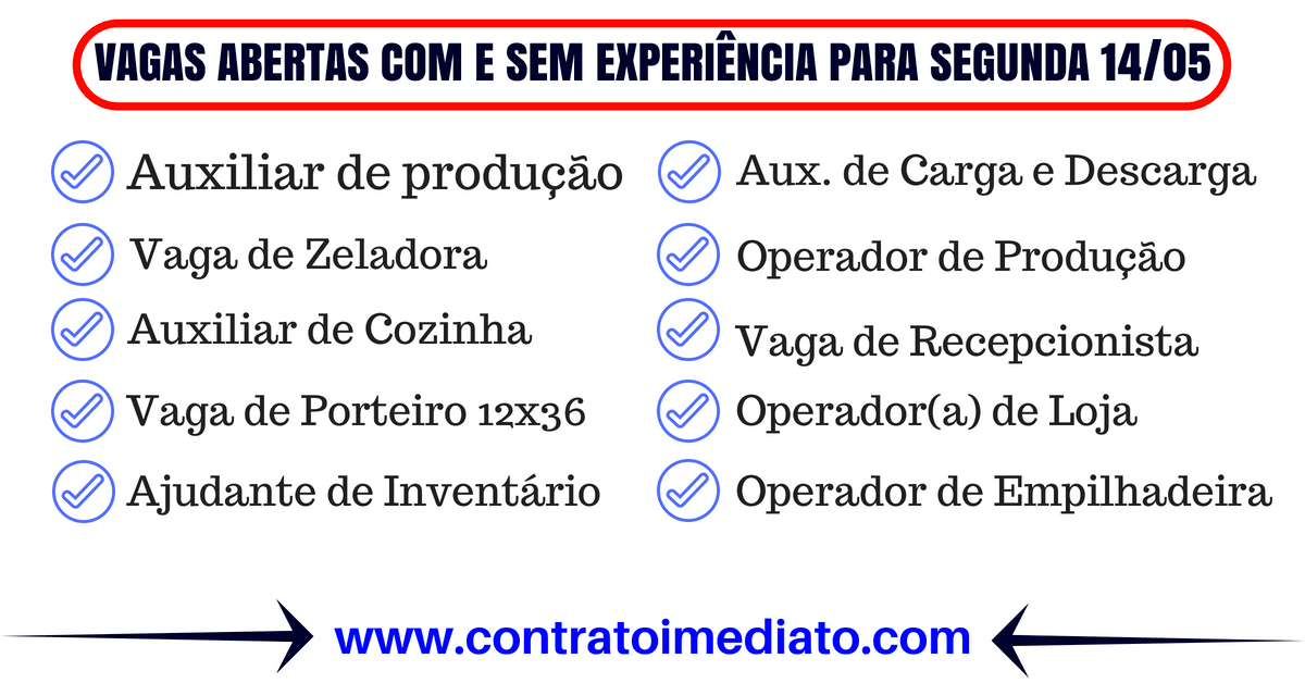 Vaga temporária com chance de efetivação. Salário: R$ 1.600,00 + benefícios. Os interessados devem comparecer a Agilidade no dia 14/05 às 09h com carteira de trabalho e currículo em mãos. Endereço: Rua José de Alencar, nº 590. Alto da XV – Curitiba – PR.