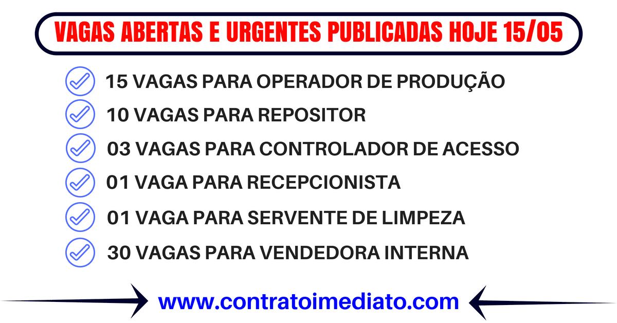 Descrição: Disponibilidade para trabalhar em escala 6×1 por turnos, ensino médio completo e experiência como Repositor; Necessário Morar nos Bairros: Santa Cândida, Boa Vista, Bacacheri ou em Colombo. Salário: R$ 1.308,00 + benefícios. Os interessados devem comparecer hoje (15/05) às 14: 00 h com CTPS e currículo em mãos. Endereço: Avenida Iguaçu, nº 1648 – Rebouças – Curitiba.